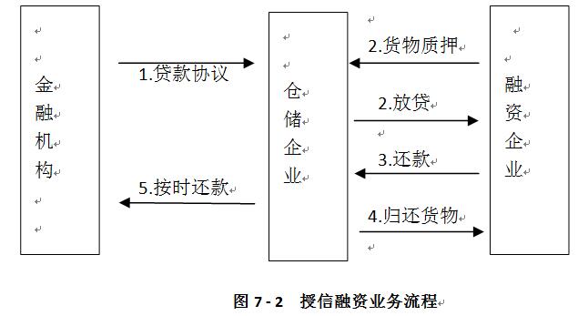授信融資模式是以金融倉(cāng)儲(chǔ)企業(yè)為中心建立一個(gè)融質(zhì)押商品倉(cāng)儲(chǔ)與監(jiān)管、價(jià)值評(píng)估、融資擔(dān)保、商品處置為一體的綜合性服務(wù)平臺(tái)。授信融資業(yè)務(wù)與倉(cāng)單質(zhì)押、動(dòng)產(chǎn)質(zhì)押監(jiān)管等業(yè)務(wù)有所不同,倉(cāng)單質(zhì)押等業(yè)務(wù)是金融機(jī)構(gòu)將資金放貸給中小企業(yè),而授信融資業(yè)務(wù)則是指金融機(jī)構(gòu)根據(jù)倉(cāng)儲(chǔ)企業(yè)的財(cái)務(wù)狀況、經(jīng)營(yíng)成果和現(xiàn)金流量,以及企業(yè)的規(guī)模信用程度等授予金融倉(cāng)儲(chǔ)企業(yè)一定的信譽(yù)額度。金融倉(cāng)儲(chǔ)企業(yè)利用金融機(jī)構(gòu)授權(quán)的這些信譽(yù)額度向需要融資的中小企業(yè)靈活地進(jìn)行質(zhì)押貸款,金融倉(cāng)儲(chǔ)企業(yè)對(duì)融資企業(yè)質(zhì)押給金融倉(cāng)儲(chǔ)企業(yè)的質(zhì)押物進(jìn)行全程監(jiān)管,而金融機(jī)構(gòu)則不參與質(zhì)押業(yè)務(wù)的具體運(yùn)作過(guò)程,在這個(gè)過(guò)程中金融倉(cāng)儲(chǔ)企業(yè)除了具有金融倉(cāng)儲(chǔ)企業(yè)的功能外還增加了金融機(jī)構(gòu)的功能,相應(yīng)地也為金融機(jī)構(gòu)承擔(dān)了一定的風(fēng)險(xiǎn),同時(shí)為一些企業(yè)特別是一些資金需求量很少、時(shí)間很短的小微型企業(yè)提供了一種非常方便的融資方式,當(dāng)然金融倉(cāng)儲(chǔ)企業(yè)增加了利潤(rùn)。但是在中國(guó)現(xiàn)行的法律框架下,金融倉(cāng)儲(chǔ)企業(yè)不能從事金融業(yè)務(wù),所以在實(shí)現(xiàn)中,往往是金融倉(cāng)儲(chǔ)公司提供擔(dān)保,融資企業(yè)將質(zhì)押品質(zhì)押給金融倉(cāng)儲(chǔ)公司反擔(dān)保來(lái)進(jìn)行融資的。授信融資模式的業(yè)務(wù)流程如圖7-2所示。