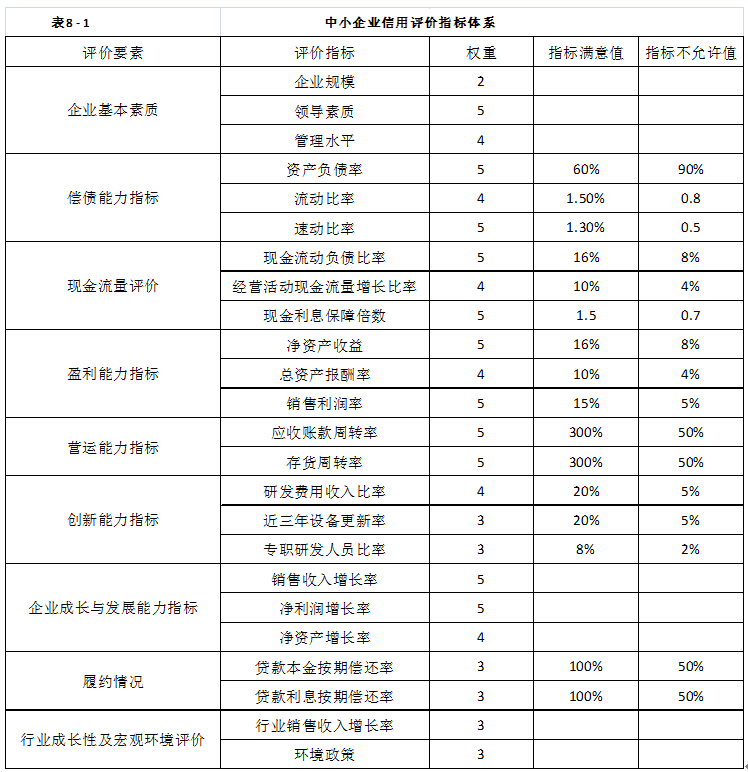 倉儲(chǔ)金融業(yè)務(wù)中,中小企業(yè)篩選的標(biāo)準(zhǔn)要根據(jù)國家對于中小型企業(yè)發(fā)展的指導(dǎo)思想,即“選擇重點(diǎn),規(guī)范操作,總結(jié)經(jīng)驗(yàn),翁不推進(jìn)”與“支持發(fā)展與防范風(fēng)險(xiǎn)相結(jié)合;政府扶持與市場操作相結(jié)合;開展擔(dān)保與提高信用相結(jié)合”的三個(gè)原則要求,結(jié)合企業(yè)的實(shí)際情況對中小型企業(yè)進(jìn)行篩選。倉儲(chǔ)金融業(yè)務(wù)是一項(xiàng)新業(yè)務(wù),為有效規(guī)避風(fēng)險(xiǎn),銀行對企業(yè)的審查相對嚴(yán)格,獲得批準(zhǔn)者一般都是各項(xiàng)業(yè)務(wù)素質(zhì)比較優(yōu)良的企業(yè)。比如廣東發(fā)展銀行在審貨時(shí),一般選取行業(yè)市場占有率位于前三位的企業(yè),而且產(chǎn)品暢銷、價(jià)格穩(wěn)定、流通性好,同時(shí)也考慮企業(yè)的財(cái)務(wù)狀況、實(shí)力、品牌知名度等,目的是控制好信貸風(fēng)險(xiǎn)。與傳統(tǒng)信貸業(yè)務(wù)的審查不同,倉儲(chǔ)金融業(yè)務(wù)對所服務(wù)的周末和小型企業(yè)的審核更強(qiáng)調(diào)企業(yè)的成長性,這涉及該企業(yè)的還款來源。此外,經(jīng)營管理團(tuán)隊(duì)、產(chǎn)品及其技術(shù)含量、市場等也是審查的重點(diǎn)。對中小型企業(yè)的信用評價(jià)指標(biāo)體系如表8-1所示,評價(jià)的要素包括企業(yè)基本要素、賠償能力指標(biāo)、現(xiàn)金流量評價(jià)、盈利能力指標(biāo)、營運(yùn)能力指標(biāo)、創(chuàng)新能力指標(biāo)、企業(yè)成長與發(fā)展能力指標(biāo)、履約情況、行業(yè)成長性與宏觀環(huán)境評價(jià)。